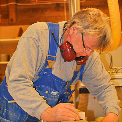 En äldre man arbetar koncentrerat i en snickeriverkstad och spänner fast ett arbetsstycke i en maskin. Han bär blå hängselbyxor med färgstänk, grå tröja, skyddsglasögon och röda hörselskydd som hänger runt halsen. Mannen lutar sig fram med händerna på trästycket och tittar noggrant på sitt arbete. I bakgrunden syns utsugsslangar, maskiner och verkstadens varma träinteriör, vilket förmedlar en tydlig känsla av traditionellt hantverk och pågående produktion.