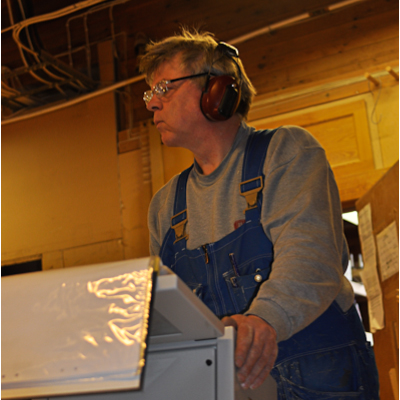 En äldre man arbetar i en snickeriverkstad och står vid en maskin, troligen en hyvel eller fräs. Han bär blå hängselbyxor, grå tröja, skyddsglasögon och hörselskydd. Mannen håller händerna på maskinens arbetsyta och tittar koncentrerat åt sidan, som om han övervakar bearbetningen. Runtom syns träväggar, kablar i taket och verkstadens varma belysning, vilket ger en tydlig känsla av hantverksmiljö och pågående arbete.
