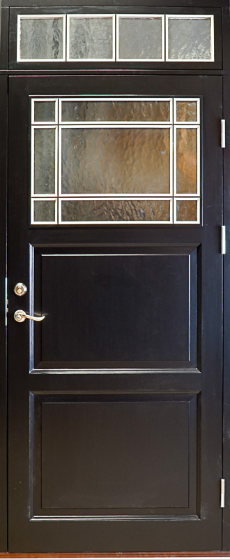 Svart ytterdörr med överljus och stor blyinfattad glasruta med dekorativ spröjs samt spegelpanel nedtill.