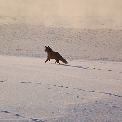 En räv springer över ett snötäckt fält i vinterljus. Snön är orörd förutom rävens spår, och i bakgrunden anas dis eller rimfrost som ger bilden en stilla och kall vinterstämning.
