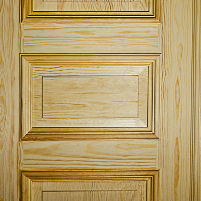 Närbild av en klassisk dörrspegel i obehandlad furu. Den profilerade spegeln och karmens mjuka fasningar framhäver träets tydliga ådring och ljusa färg, med fokus på traditionellt snickerihantverk och detaljerad ytfinish.