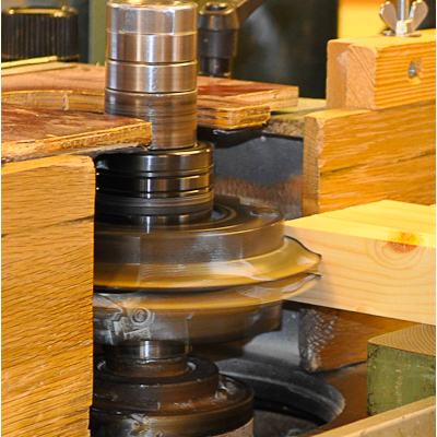 Närbild av en träbearbetningsmaskin i verkstad där ramträ till innerdörrar formas. Ett ljust trästycke förs in mot ett snabbt roterande stålverktyg mellan träanhåll, vilket visar ett moment av exakt profilering och traditionellt snickeriarbete.
