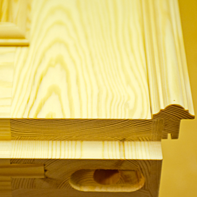 Detaljbild av en trädörr i furu med tydlig ådring, där ett profilerat listverk möter dörrbladet. Bilden lyfter fram träets struktur, hantverksmässig passning och den mjuka formen på den bearbetade kanten.
