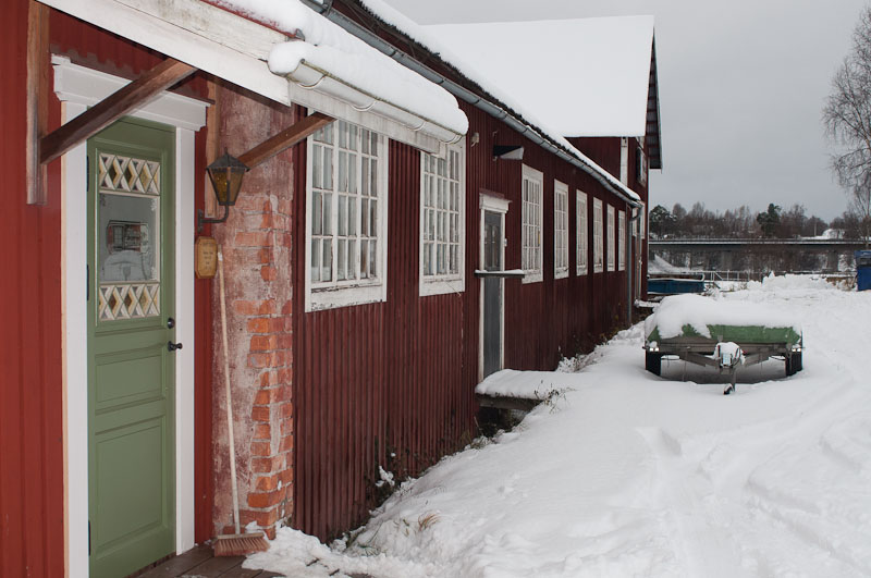 Röd träbyggnad med vita fönster och snötäckt tak under vintertid. I förgrunden syns en grön ytterdörr med spröjsade glasrutor och en tegelmur vid entrén. Marken är täckt av djup snö, och längs byggnaden leder en snöig gång mot en liten båt vid vattnet i bakgrunden. Stämningen är stillsam och vintrig.