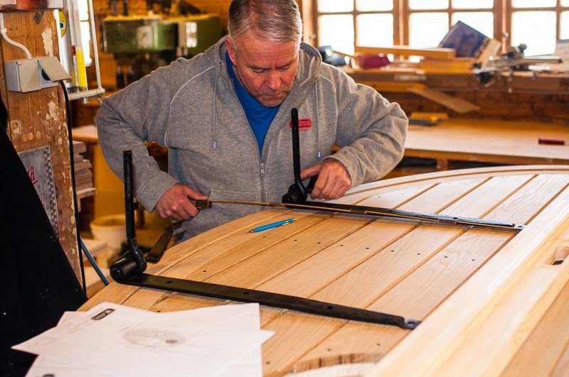 Jorma mäter här in hur gångjärnen skall sitta. Inte en helt lätt uppgift på en oval dörr.